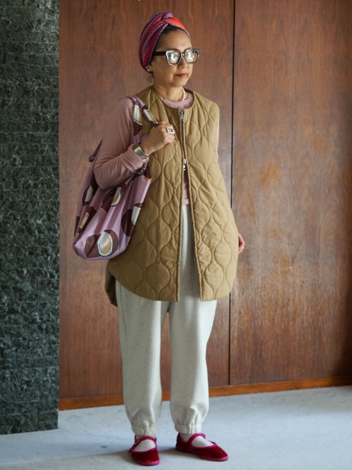 同系色のコットンエアリーニットにカーキのカーゴパンツの色合わせは、すぐにでもマネしたいコーディネート!
